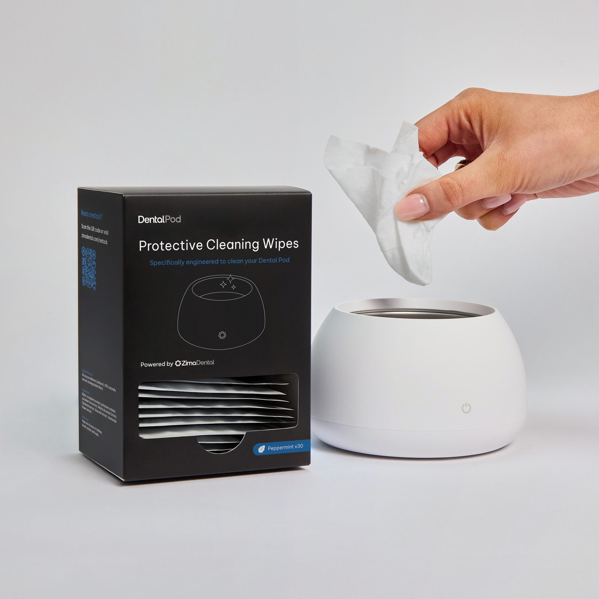 After cleaning, use a wipe to clean your Pod's tank and prepare it for the next cleaning cycle. The wipes leave a thin layer of Aloe and Oat extract, which have mild anti-microbial and anti-fungal properties. This helps keep your Dental Pod hygienic and safe from airborne bacteria without using harmful chemicals.